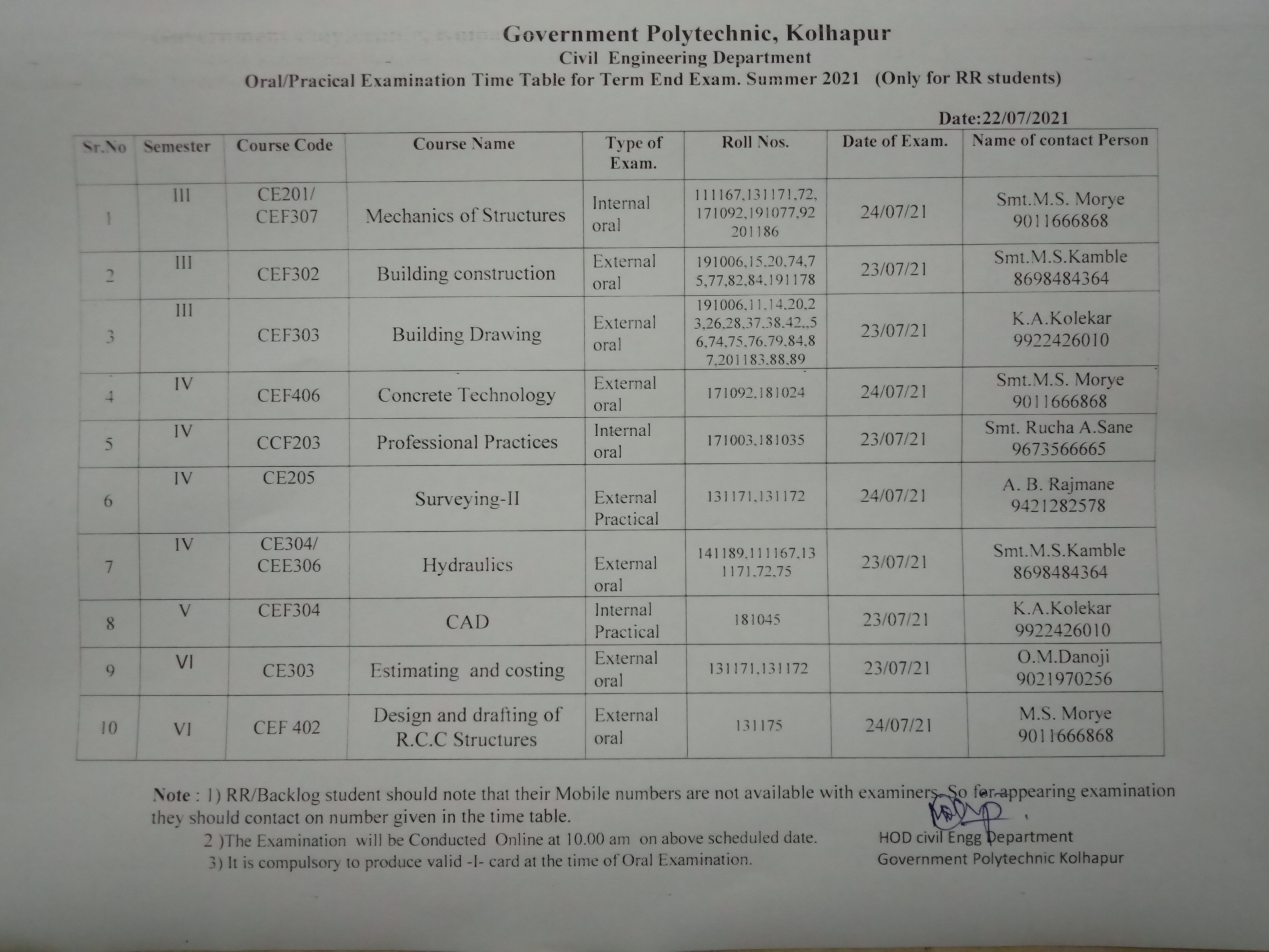 - Civil RR students Practical Exam Time Table ( Shift- II student should follow the same time table)